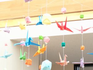 玄関で皆さんをお出迎えするのは、折り鶴の吊るし飾りと