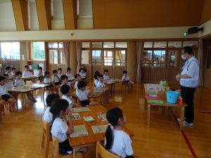 水族館を作る時には、水の量や空気の量、圧力など様々な工夫が必要という事にも子ども達は気が付き、慎重に水の量を調節していました。その真剣な眼差しは、さすが年長児ひまわり組です。一生懸命に最後まで自分で考えながら取り組む力がとても素敵ですね。