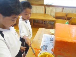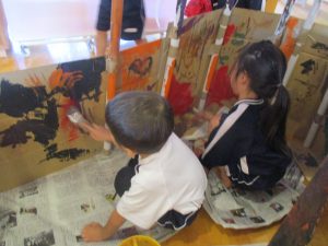 年中、年長児が製作する様子を見て年少児も「絵の具やってみたい!」、「どうやってするの?」と興味津々です。