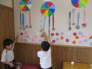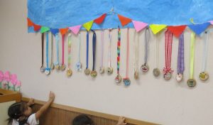ピカピカの金メダルは、運動会の前日まで、保育室に飾られています。