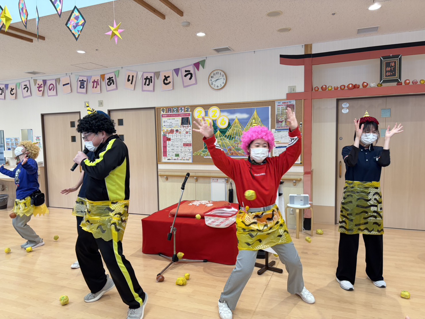 本日は、金沢福祉専門学校の実習生さんが2名加わり、職員と一緒に鬼に扮し