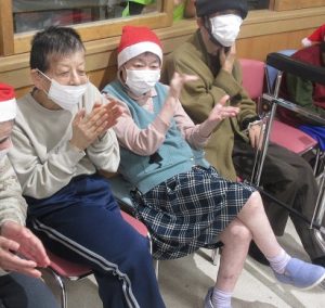 午前中は年賀状づくりを行い、サンタやトナカイのカチューシャを身につけながら、和やかな雰囲気の中で作業スタート。皆様それぞれ、日頃お世話になっている方やご家族に向けて、メッセージやデザインを一つひとつ丁寧に考え、真剣な表情で年賀状を作成されていました。