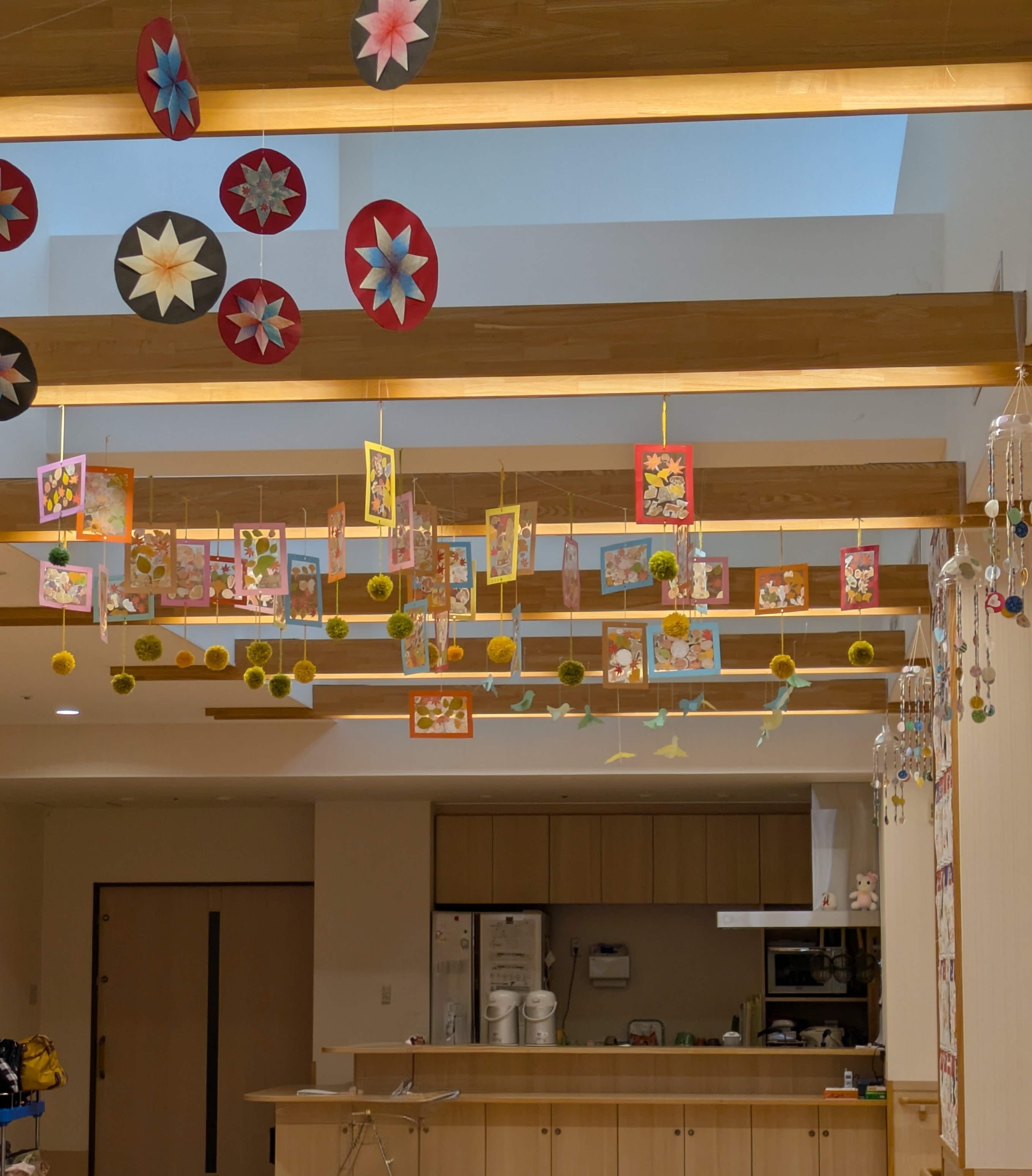 完成した作品は天井の梁から吊るし、