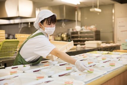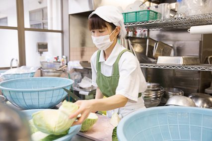 現在入所されている利用者様は約200人おり、その方たちの1日の食事を作っています。野菜の仕込みから、調理・盛り付け・配膳をし、食器の洗浄迄が主な仕事です。現在はソフト食も開始し、力を入れています。その他、四季折々の行事や誕生会には、特別食を用意し、利用者様に喜んで頂いています。