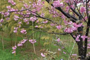 第二万陽苑で収穫したたけのこを展示(写真左)。満開の八重桜と筍畑(写真右)