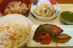 たけのこご飯、赤魚の幽庵焼き、たけのこ清汁、若竹煮、二色水羊羹。