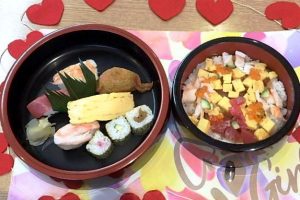 お寿司を食べられない方のための献立。大根煮風ムース、ウナギかば焼き風ムース。細かく刻んだちらし寿司の具が入っている、ちらし粥等です。