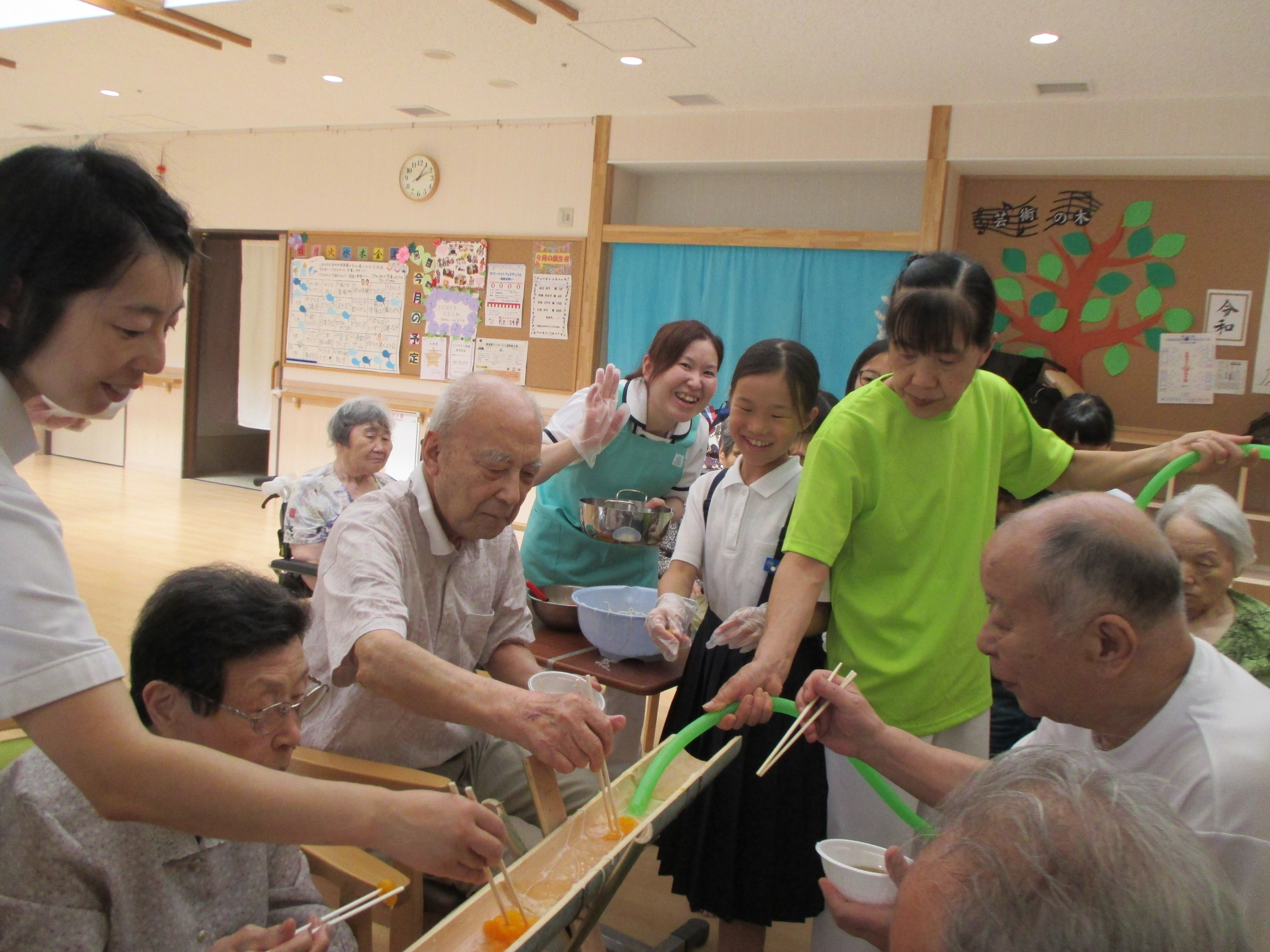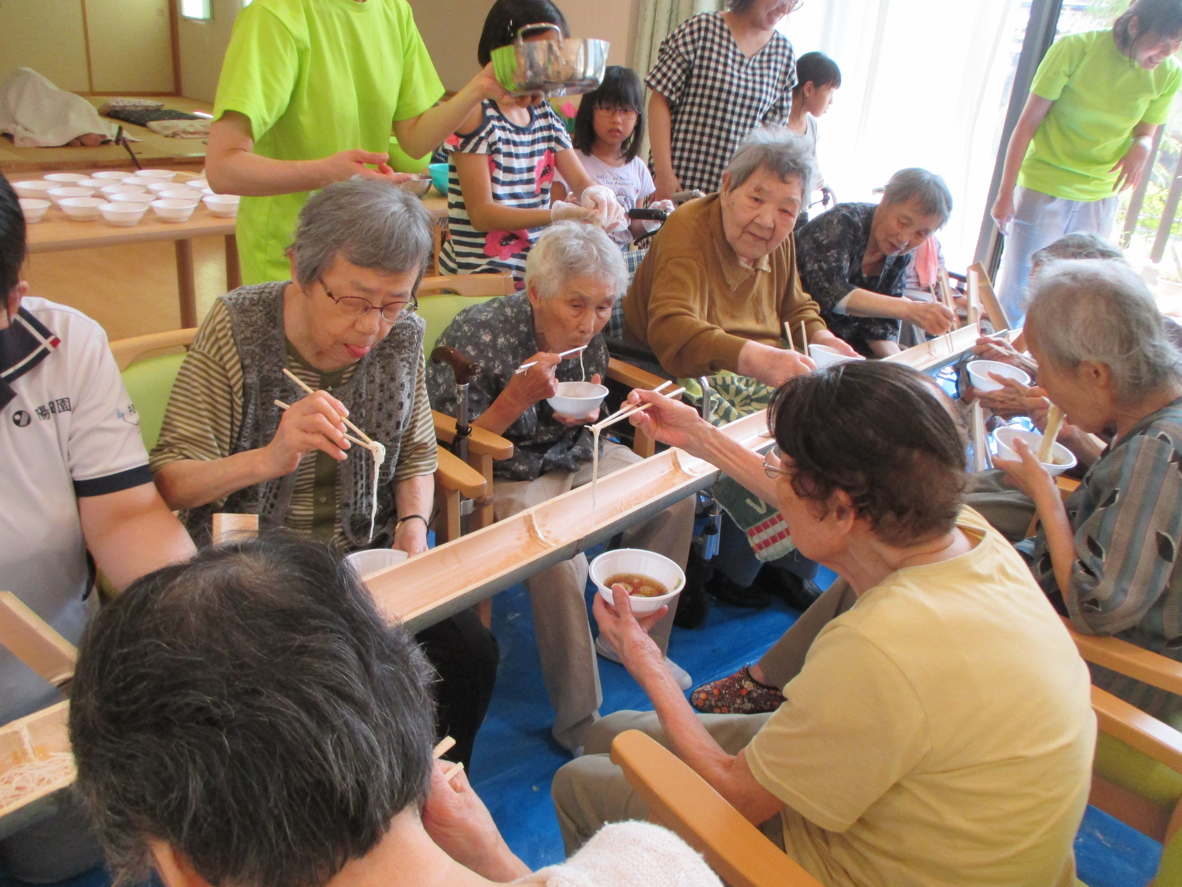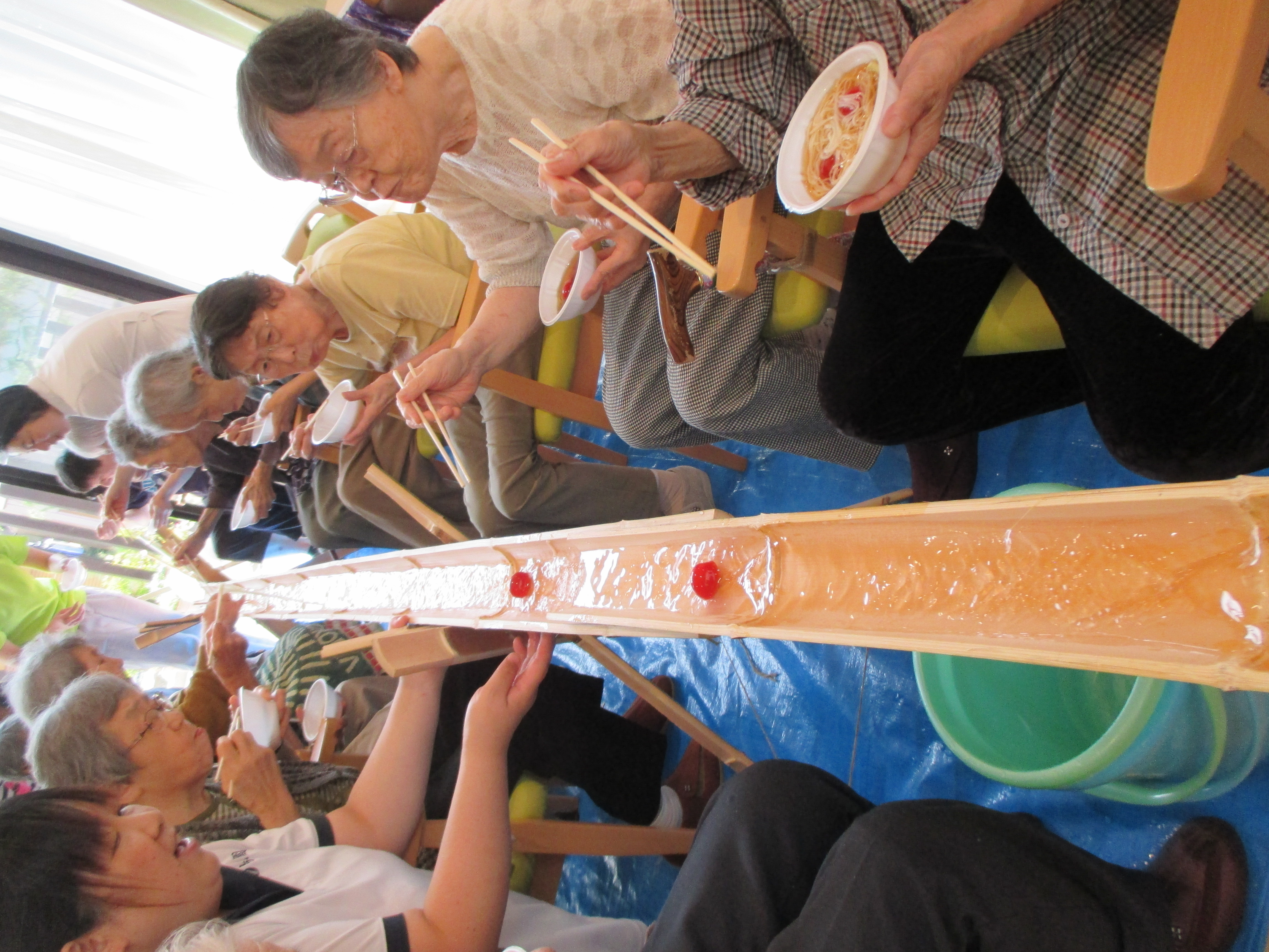 学童の子どもたちと一緒に今年初めての試み“滝の白糸”流しそうめん会を行いました(*^。^*)