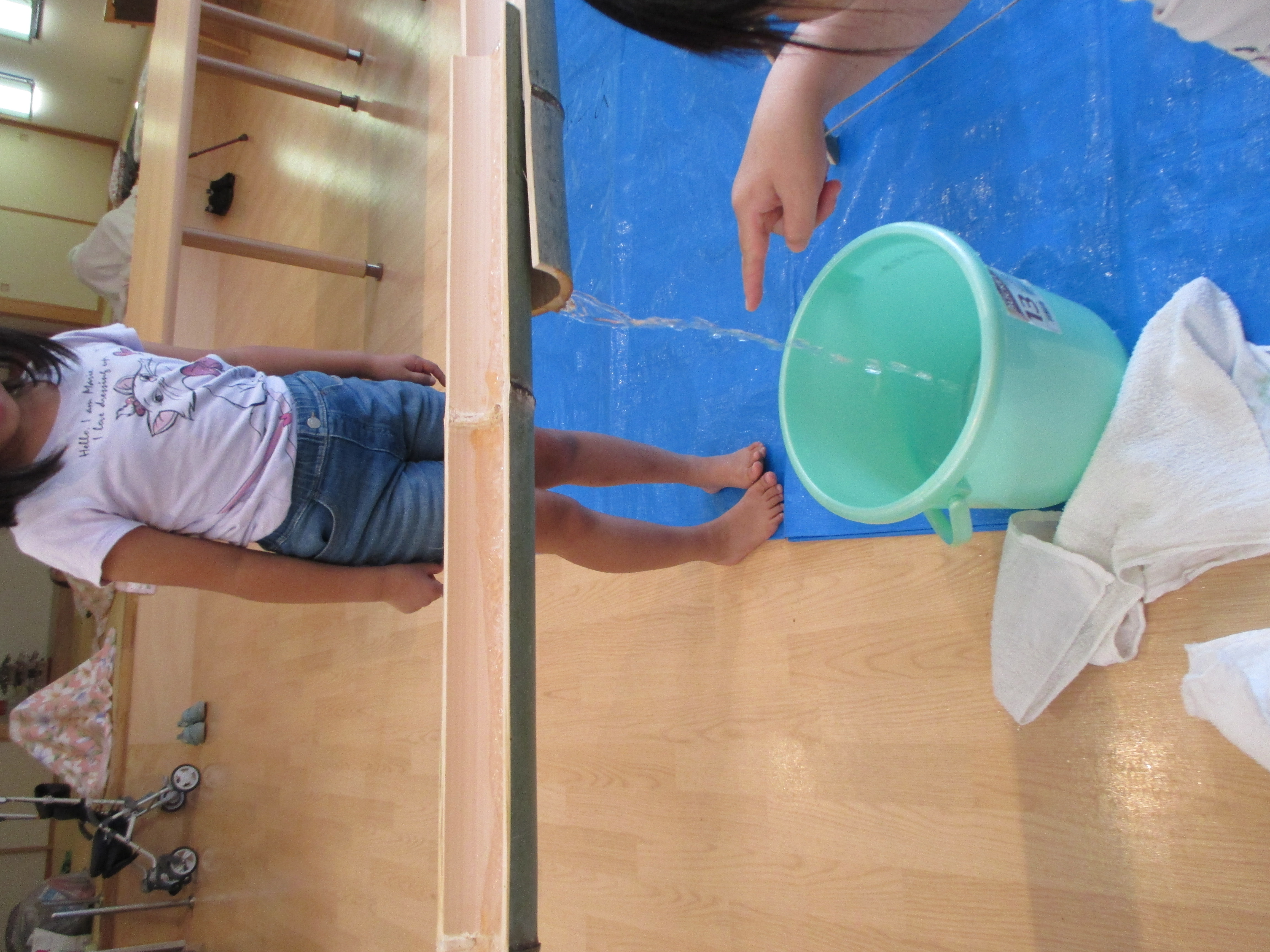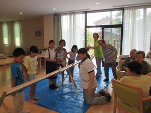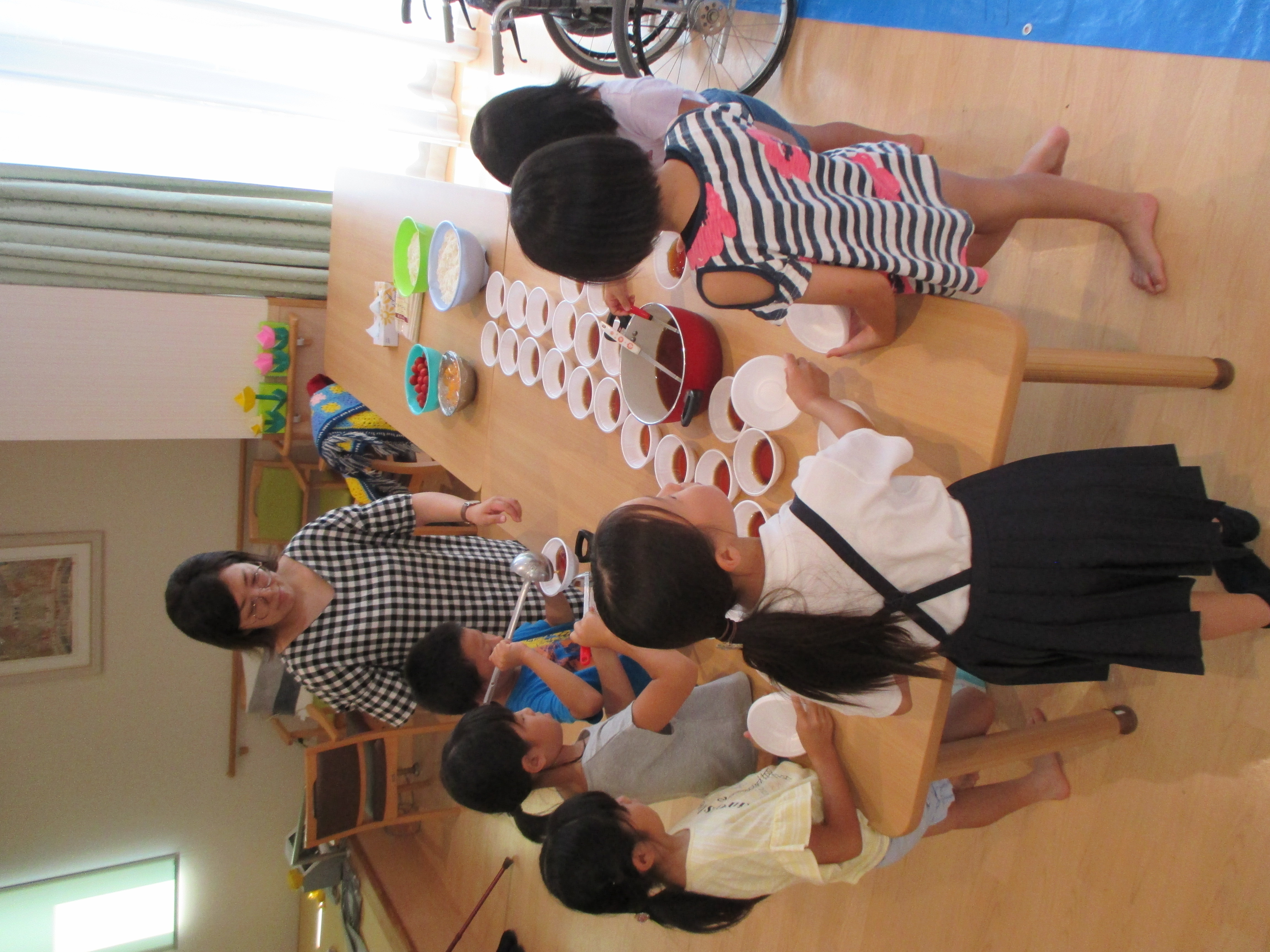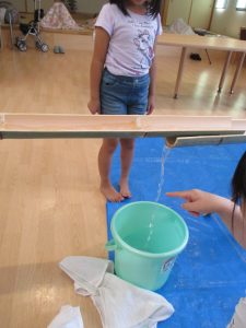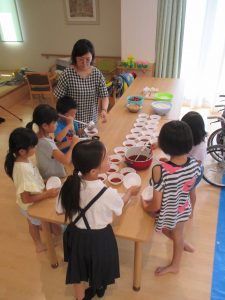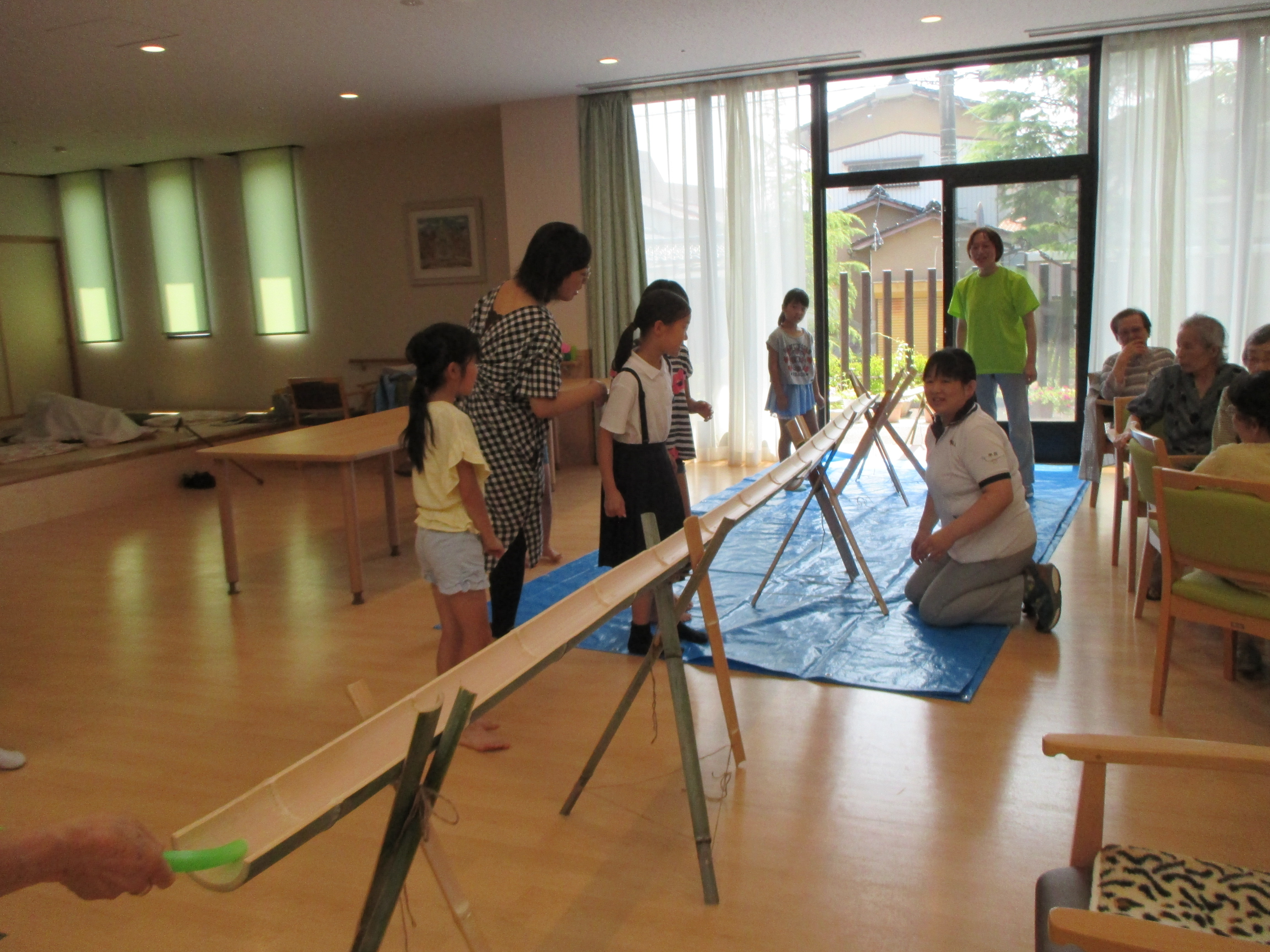 学童の子どもたちと一緒に今年初めての試み“滝の白糸”流しそうめん会を行いました(*^。^*)
