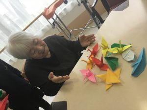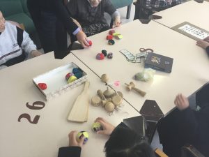 生徒さんが持参したお手玉やけん玉、おはじきや折り紙で