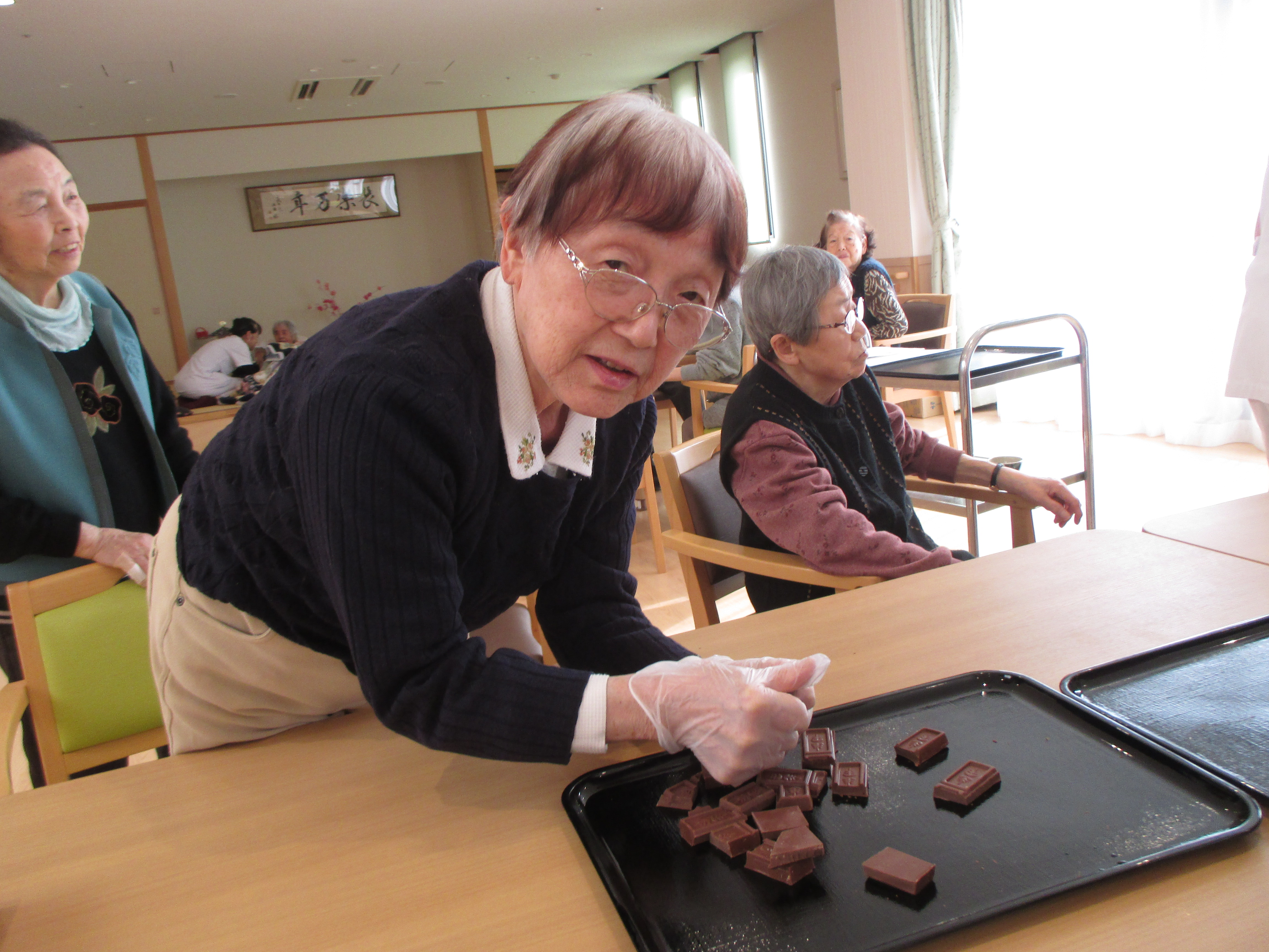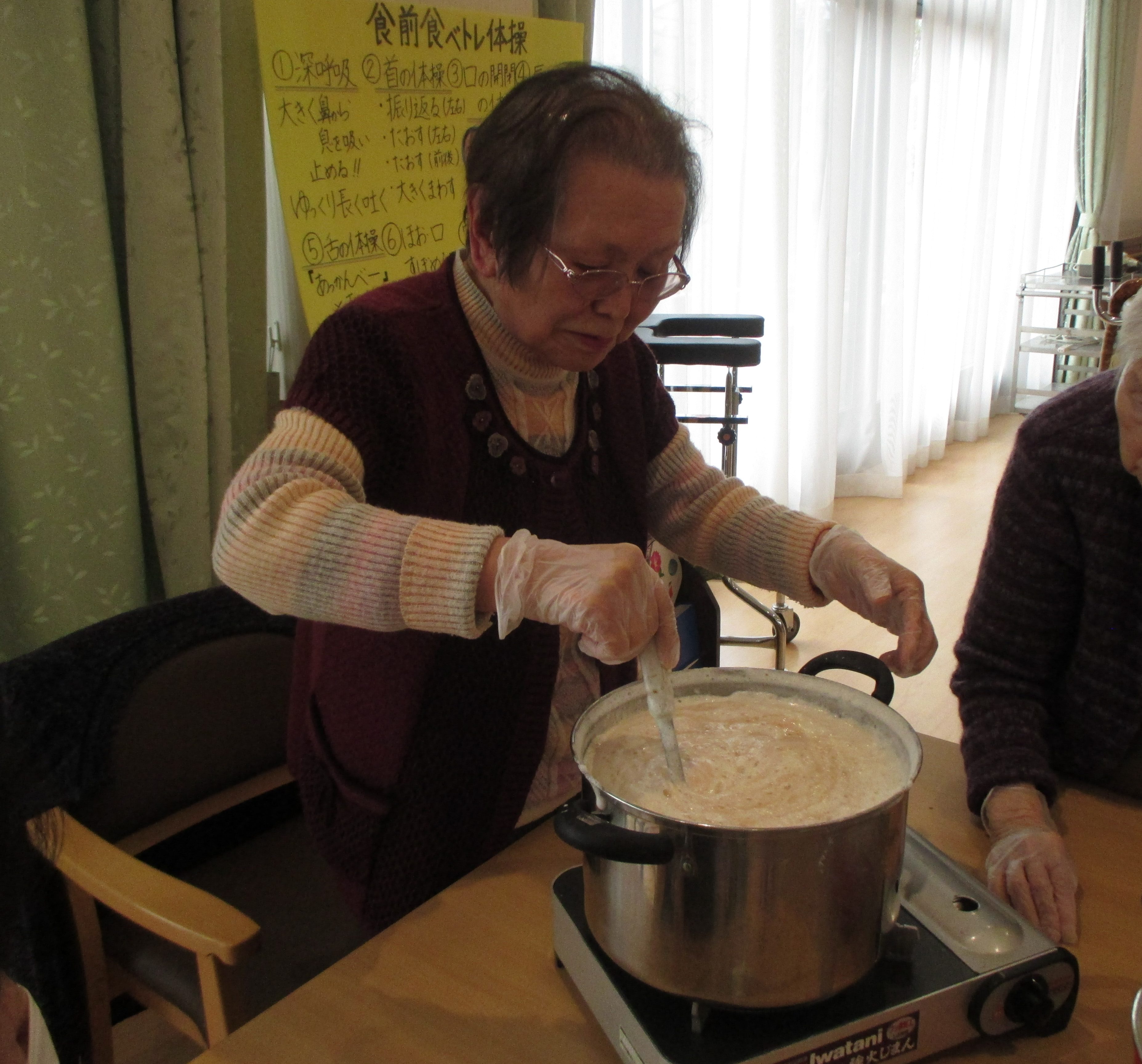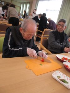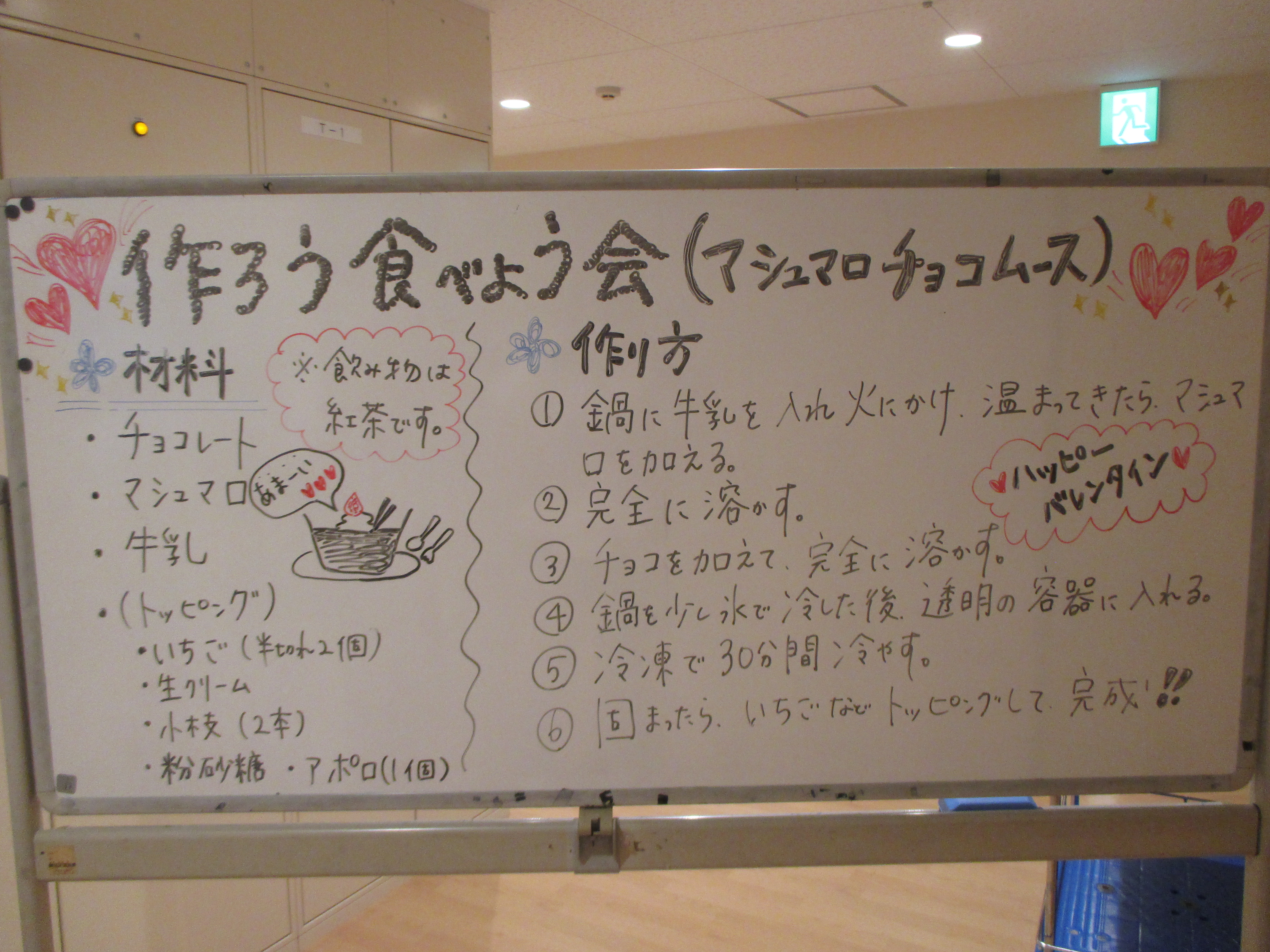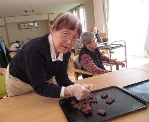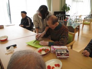 作ろう食べよう会 ~バレンタイン~ 陽風園デイサービスセンター2020年2月14日 本日はバレンタインデーです!! 陽風園デイサービスでは、“マシュマロDEチョコムース”を作りました♡ ⇐ 材料と手順はこちら… 今日の主役のチョコレートを細かくします! 特大のマシュマロも小さくカット!! 牛乳、マシュマロを鍋に入れて溶けるまでかき混ぜます! 男性陣はイチゴをカット!おみごとな包丁さばき!! 出来上がった生地はカップに流し込みしばらく冷やします!! イチゴ、飾りチョコを盛り付けて 完成 !! 美味しく頂きました!!