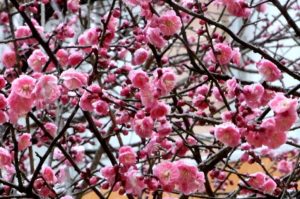 数少ない雪の日ではありましたが、美しい写真が撮れました。中庭に咲いた紅梅に雪が積もり、背景の青空の色彩のコントラストと相まって美しい。(2月6日の画像)