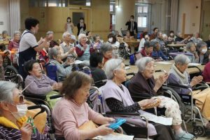 なんと、多田由実子さんの歌に合わせて、鈴やタンバリンを持ったご利用者様他、全員で様々な手拍子をとるという面白い趣向があり、「あんたがたどこさ」の曲の「さ」の歌詞だけ手を叩かないという課題にも、ご利用者様は上手に手拍子をとられていました。