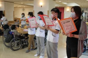 いつもはご家族様にお越しいただき、ご一緒にお祝いしていただくのですが、新型コロナウイルス感染予防のため施設閉鎖を実施しております。ご利用者様にお会いできないご不便をおかけしているにも関わらず、面会制限を快くご承諾いだきましたご家族様に感謝申し上げます。