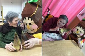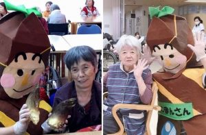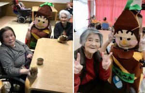 たけのこの精、にまんさんと掘りたての筍を愛でながら記念撮影。皆様の笑顔こそが元気の素です。この時節柄、ご利用者様の笑顔が何よりもありがたいと感じます。