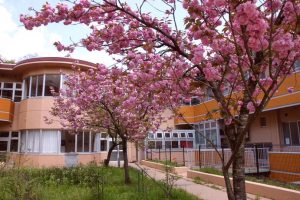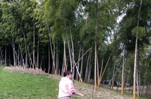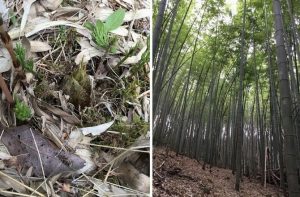 中庭の八重桜が満開になりました。    敷地にある竹林へ筍の収穫に向かいます。