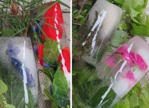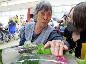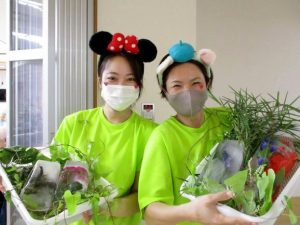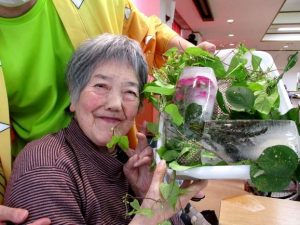 牛乳パックで作った氷柱花草、いかがですかあ。介護職員の笑顔がいいね