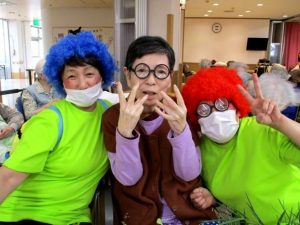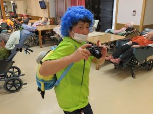 副施設長とPTまでもが仮装で奮闘しました(写真右)。撮影や余興のため一部職員がマスクを外していますが、通常はマスク着用を徹底しております。ソーシャルディスタンスが守られていないのではないかというご指摘もあるかと存じますが、職員は毎日検温を実施し、全員に携帯用アルコールスプレーを持たせるなど、感染症を持ち込まないことに腐心しています。