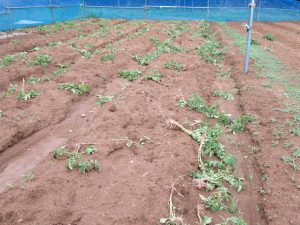 ジャガイモは根こそぎ食べられ、インゲン豆、枝豆、とうもろこし、ダイコン…は根元から引き抜かれ、、、、
