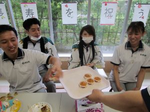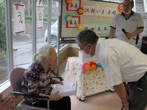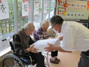 卒寿の方には石川県からのお祝い品を、米寿の方には金沢市からのお祝い品を施設長より渡され、他の利用者様からも祝福を受けられました。 おめでとうございます!!