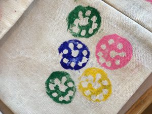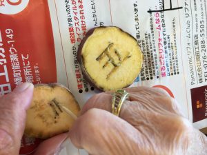 今日はさつまいもに竹串で文字や模様を彫り、ハンコを作ります。