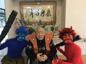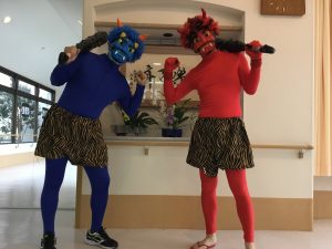 節分は、職員が扮する赤鬼・青鬼にボールを当て