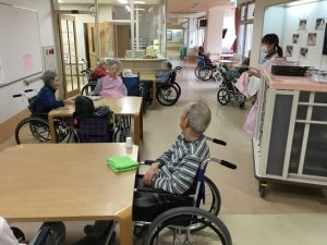 食事が運ばれてくるまでの時間は、余暇として機能させたり、顔なじみの入居者と談笑したりして過ごしています。