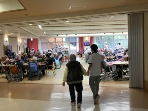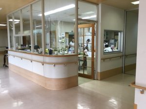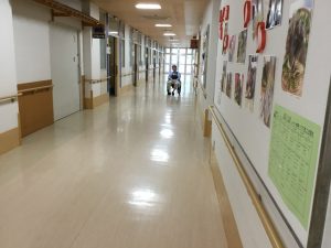 食堂からまっすぐ見える棟になり、車いすを自分で操作できる方が、日常リハビリとして食堂に向かってこれます。