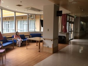 その廊下の中間に中庭を望める談話室があり、テレビがかけられていますので、ここでゆっくりテレビを見られる方もおいでます。