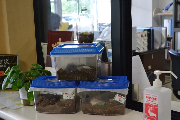 あいにく、虫かごは3つしかないので、一つはお引越し用(お婿行き用)のお手製のPETボトル籠も使って、現在嬉しいことに満室状態です。