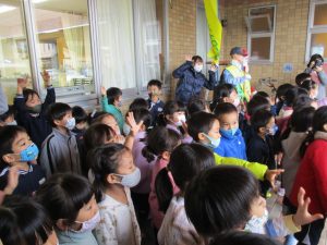 子ども達は、サポート隊の方に日頃の感謝を「ありがとうございます」という言葉で伝え、その後「頑張って」と青パトがパトロールに行くのを見送りました。