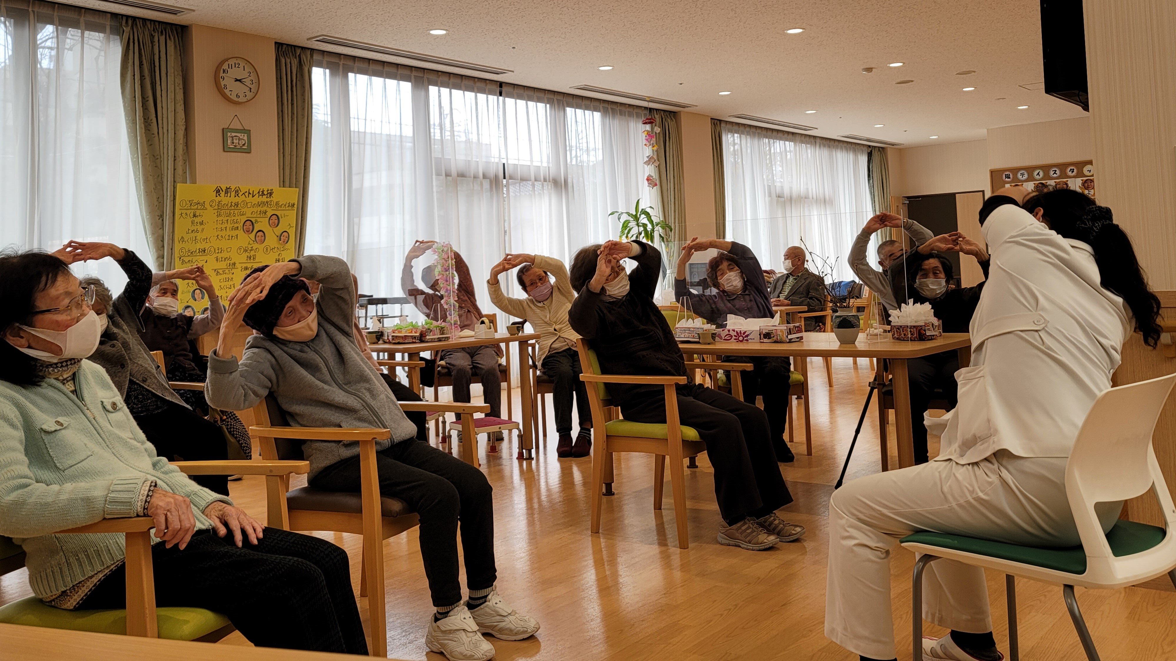 陽風園デイサービスセンターでは、転倒予防体操、認知症予防体操、リハビリや食前の口腔体操に、皆様日々楽しく真剣に励まれています!
