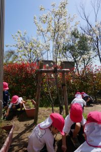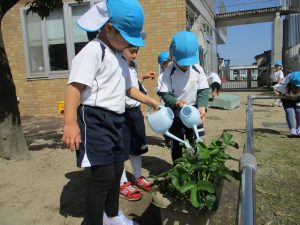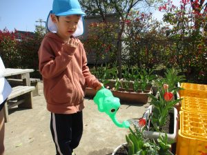 ゆり組は園庭のイチゴやチューリップにお水やりもしています。