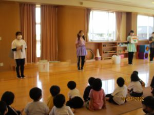 保育教諭の劇から由来に触れ、みんなで”鯉のぼりのように元気に大きくな~れ”とお祝いしました。
