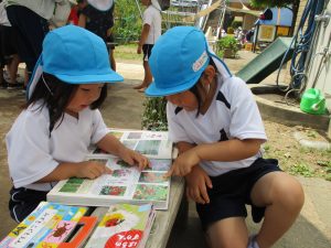 花壇の側では図鑑を開き「これは何のお花?」と調べています。