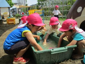みずきこども園では「困った事があったら、ひまわり組(年長児)に聞こう!」というルールの元、保育教諭も保育を行っています。その為、年下児も年長児ひまわり組のお兄さん、お姉さんを頼り「どこにあるの?」と困っていることを聞いたり、困った様子の年下児に気が付きひまわり組がさりげなく、蛇口を捻りお水を出してあげたり嬉しい姿も見られるようになってきましたよ。