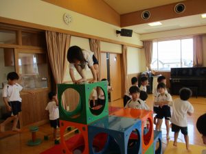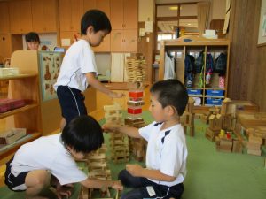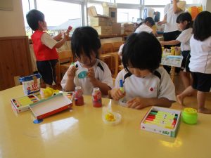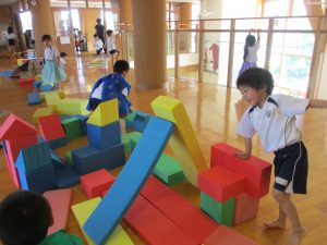 毎日のフリータイムで年少児さくら組も少しづつ、フリーデイやフリータイムの時間が楽しくなり今では、みんなお部屋から出て、共有スペースとなるホールや園庭、制作コーナーへと逞しく遊びに行っています。
