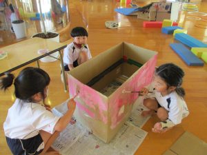 大きな段ボールに色を塗るのは楽しいね!