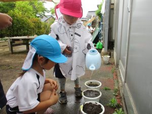 先日、フリータイムの時間に園庭でアサガオの種を植えました。