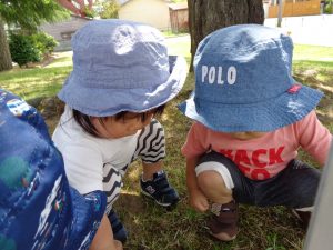 「これは何かな?」保育士やお友だちと覗き込んでいますよ。何がいたのかな??