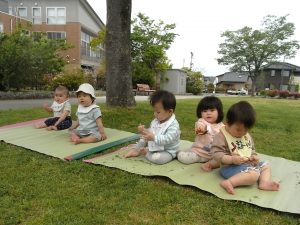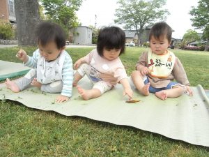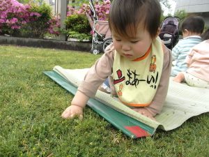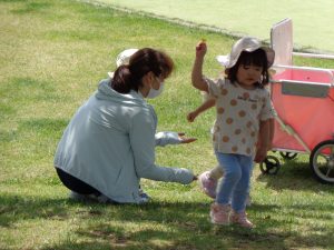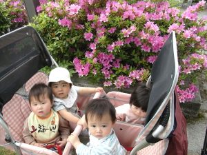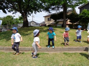今日は0~1歳児クラス(うめ、もも組)のお散歩の様子を紹介します。