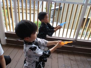 お化けの的めがけて「バン!バン!!」水鉄砲が飛びます。