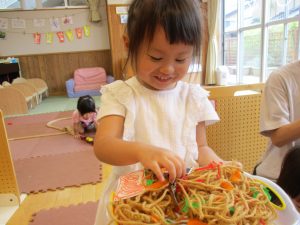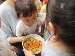 焼きそば屋さんが大人気!!1歳児、もも組のお友だちも買いにきてくれました。