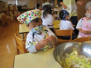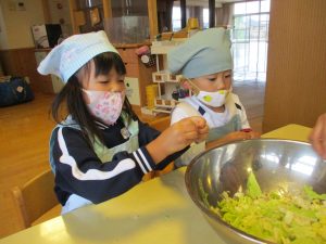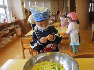 年少児さくら組は、めった汁に入れる白菜、竹輪、こんにゃくをちぎりました。