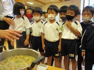 年長児ひまわり組は昨日、給食先生からめった汁の材料を聞き、どのような切り方がその野菜に合うのか一緒に考え学びました。