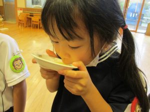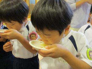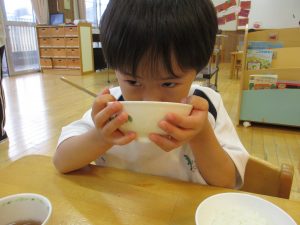 「この野菜は、硬くて難しいね」「お家でもしたことあるよ」「あ!出汁のにおいするね」と、五感をフル回転させ感じた事を言葉で一生懸命に伝え、友だちや保育教諭と共感し楽しんでいました。