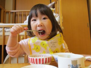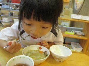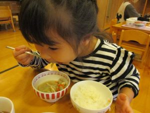 給食は小さなクラスのお友だちも「おいしいね!」と大きなお口で頬張りました。