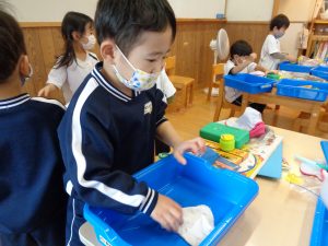 3歳児さくら組さんもお掃除がんばります。