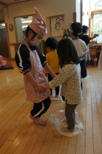2歳児たんぽぽ組さんと5歳児ひまわり組さんで力を合わせてふみふみ。