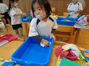 3歳児さくら組さんもお掃除がんばります。